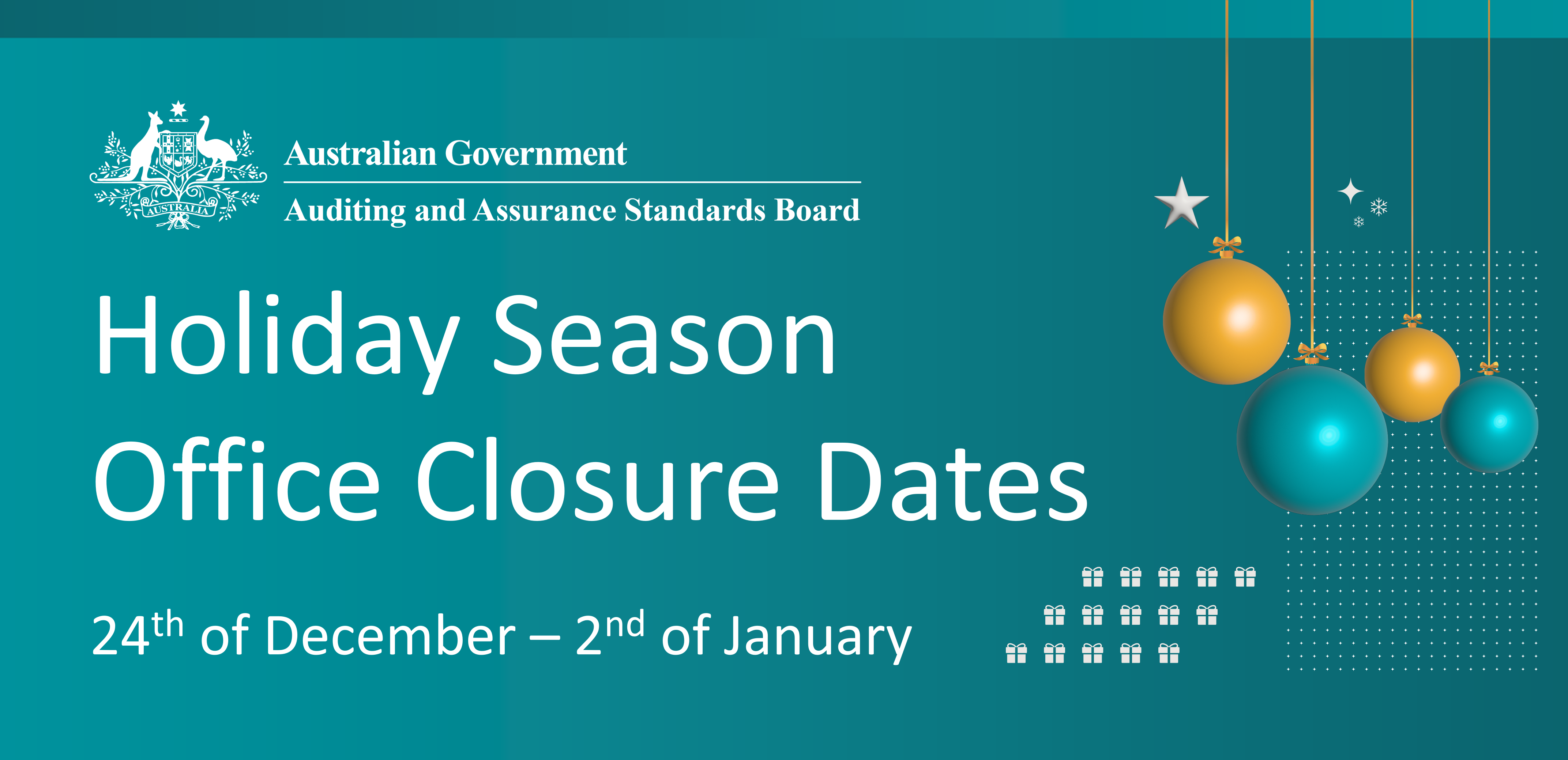 The Auditing and Assurance Standards Board (AUASB) office will be closed for the holiday period from Wednesday 24 December 2025 through to Friday 2 January 2026.