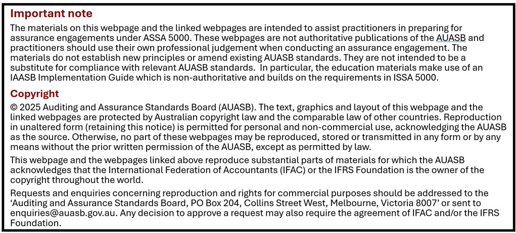 The AUASB’s ASSA 5000 General Requirements for Sustainability Assurance Engagements (issued 28 January 2025 and amended to July 2025) (ASSA 5000) is based on the IAASB’s ISSA 5000 General Requirements for Sustainability Assurance Engagements.