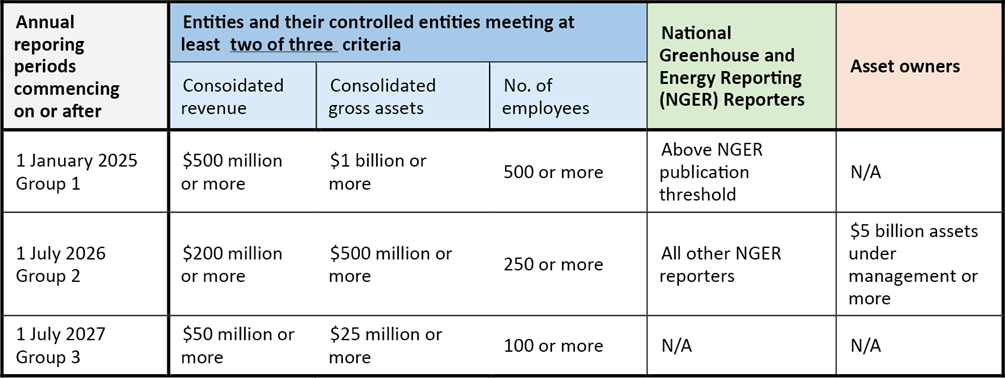 Reporting commences with the largest entities for financial years beginning on or after 1 January 2025. The table below shows the criteria for each group and the commencement dates for reporting.