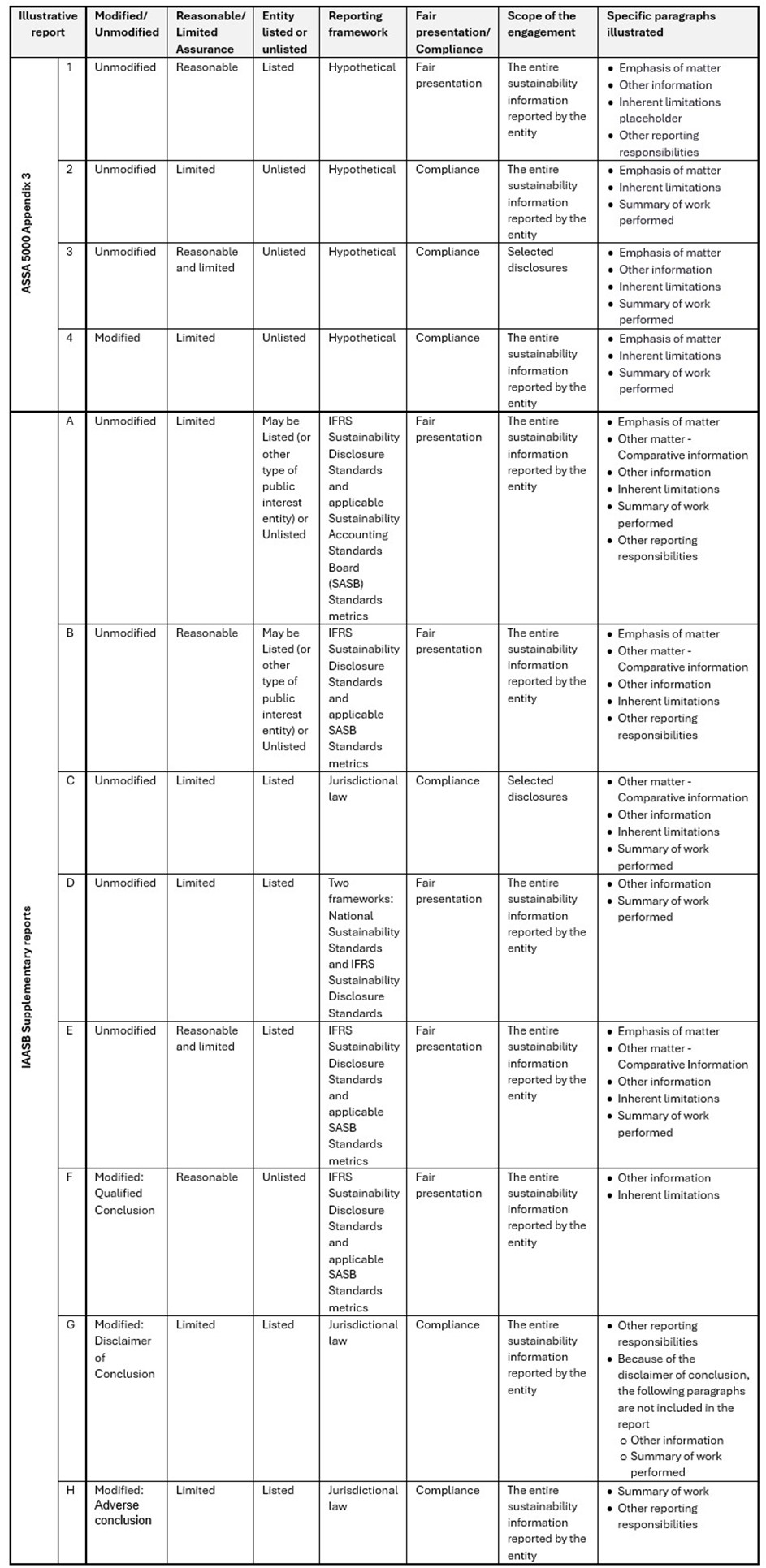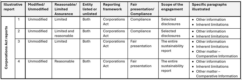The tables below outline illustrative sustainability assurance reports available from the AUASB and IAASB. Hyperlinks to the reports appear at the end of this webpage.