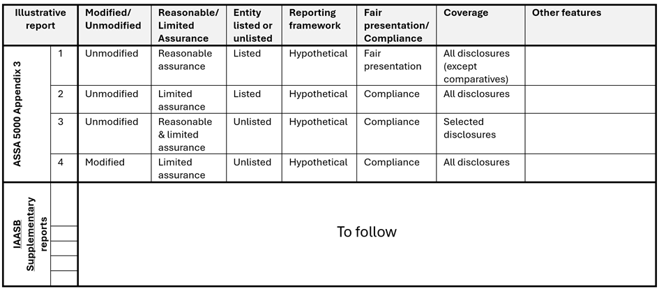 The tables below outline illustrative sustainability assurance reports available from, or under development by, the IAASB and AUASB.