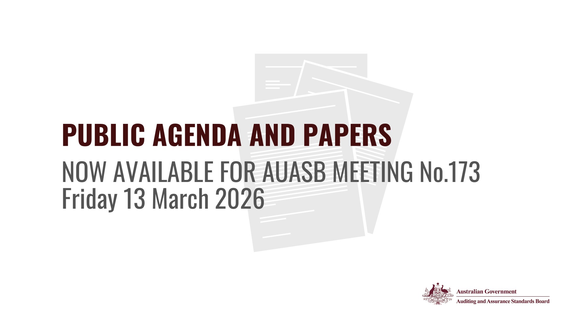 The Public Agenda and Papers are now available for AUASB meeting 172 to be held on Wednesday 25 February 2026.