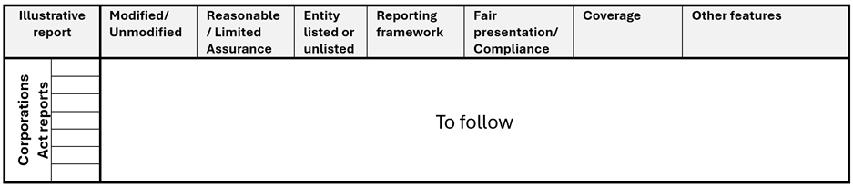 The tables below outline illustrative sustainability assurance reports available from, or under development by, the IAASB and AUASB.
